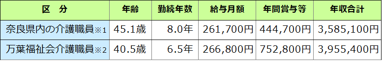 ■奈良県内の施設介護職員の賃金との比較は下記のとおりです。